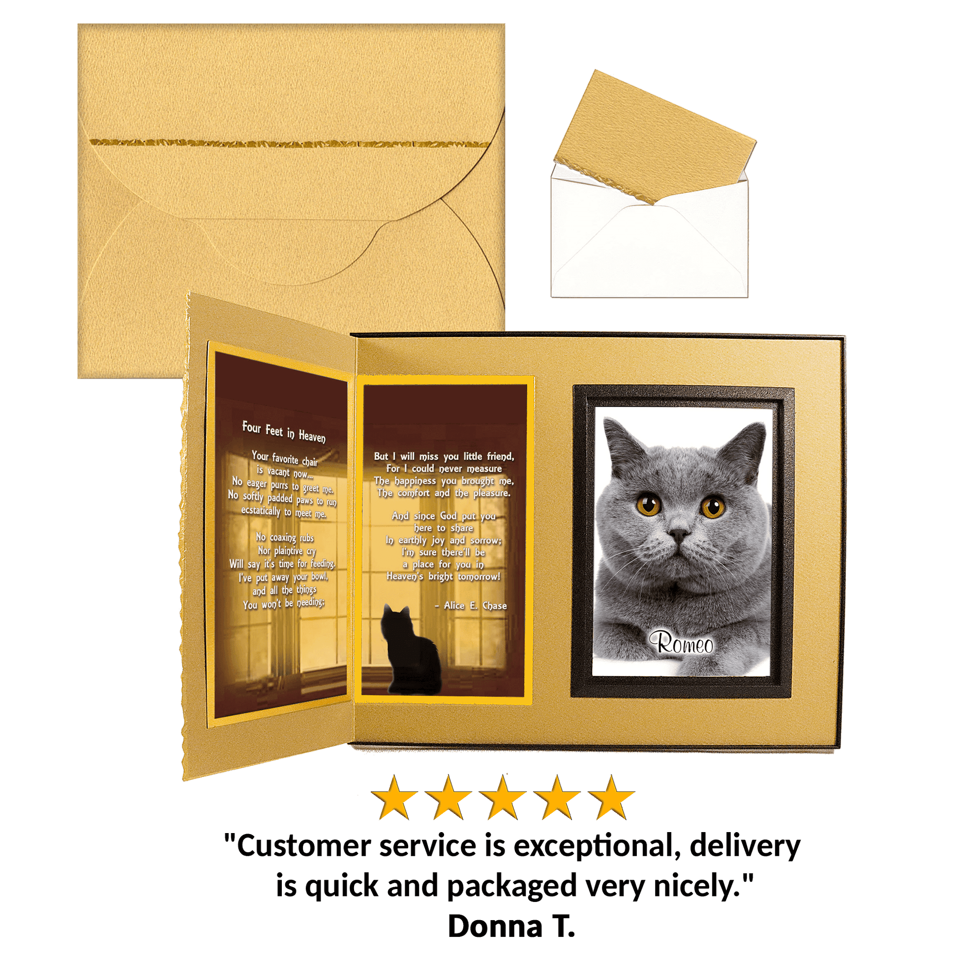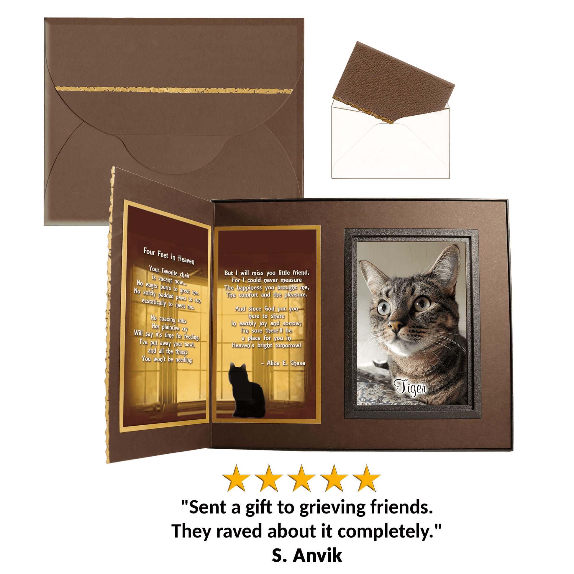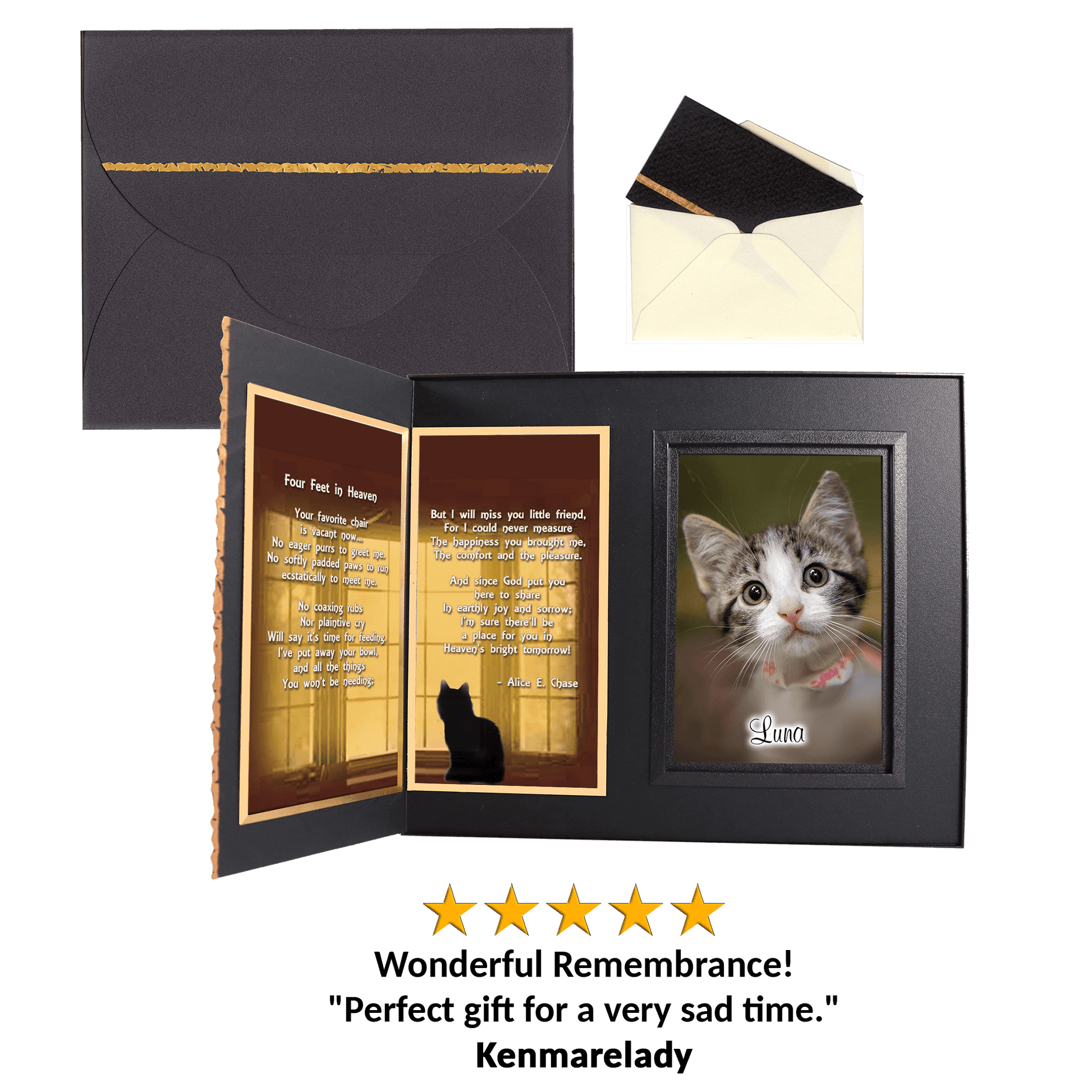 Personalized for you, this gift includes your choice of comforting poems, the pet’s photo, a gift card for your personal message... all elegantly presented in a matching gift box to make a complete gift ensemble.