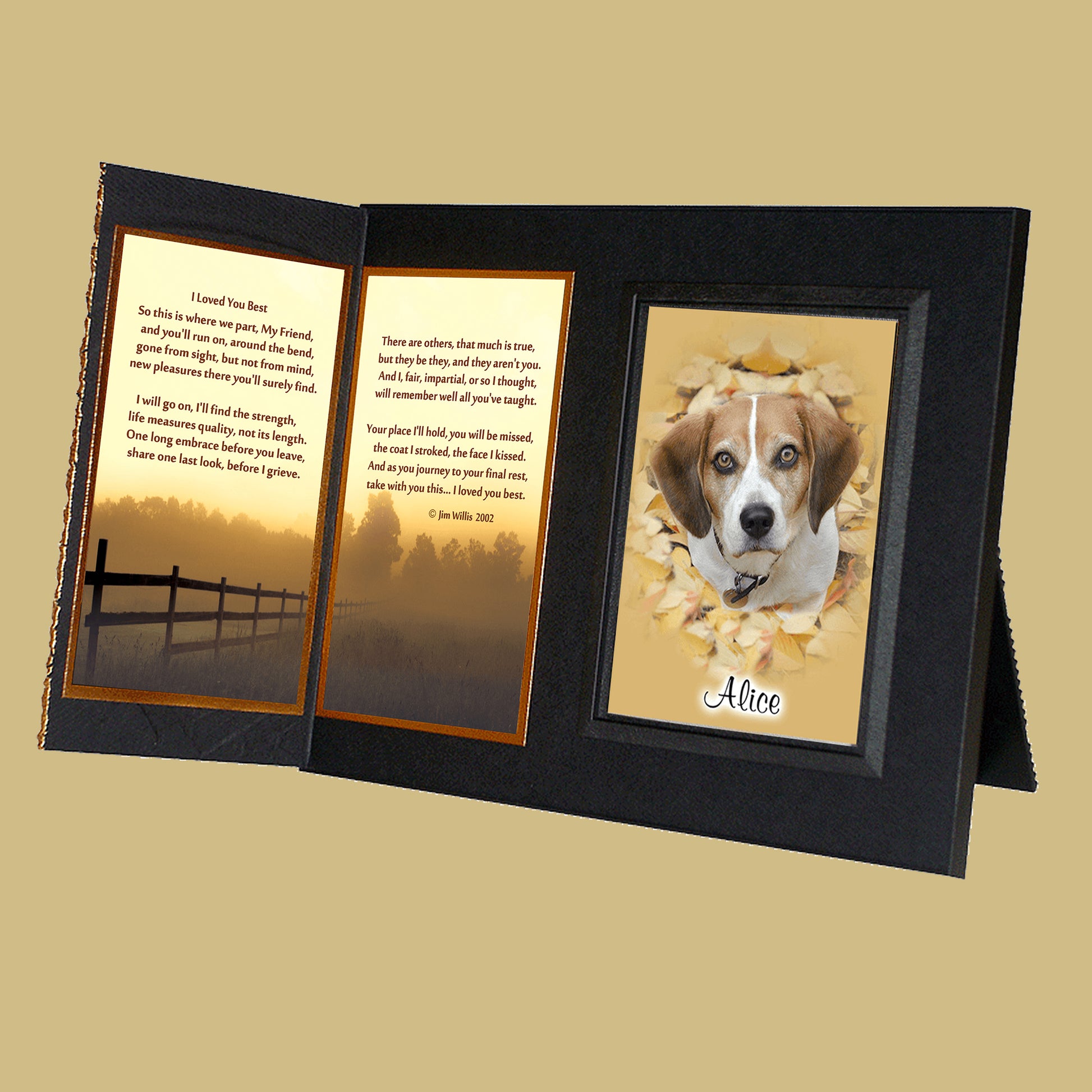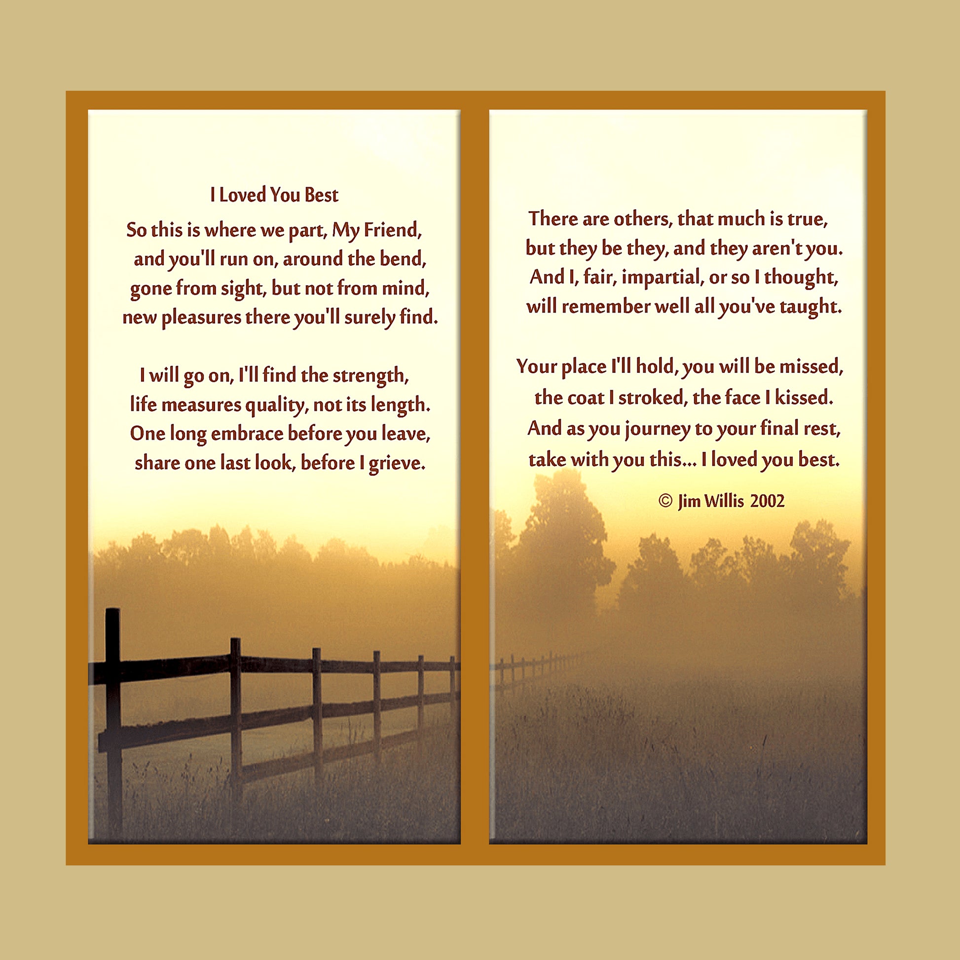 Jim Willis' poem, "I Loved You Best" softens the transition from loss, to grieving, to healing with just the right measure of strength, acceptance and solace... a sentiment fitting the tribute to a special companion.
