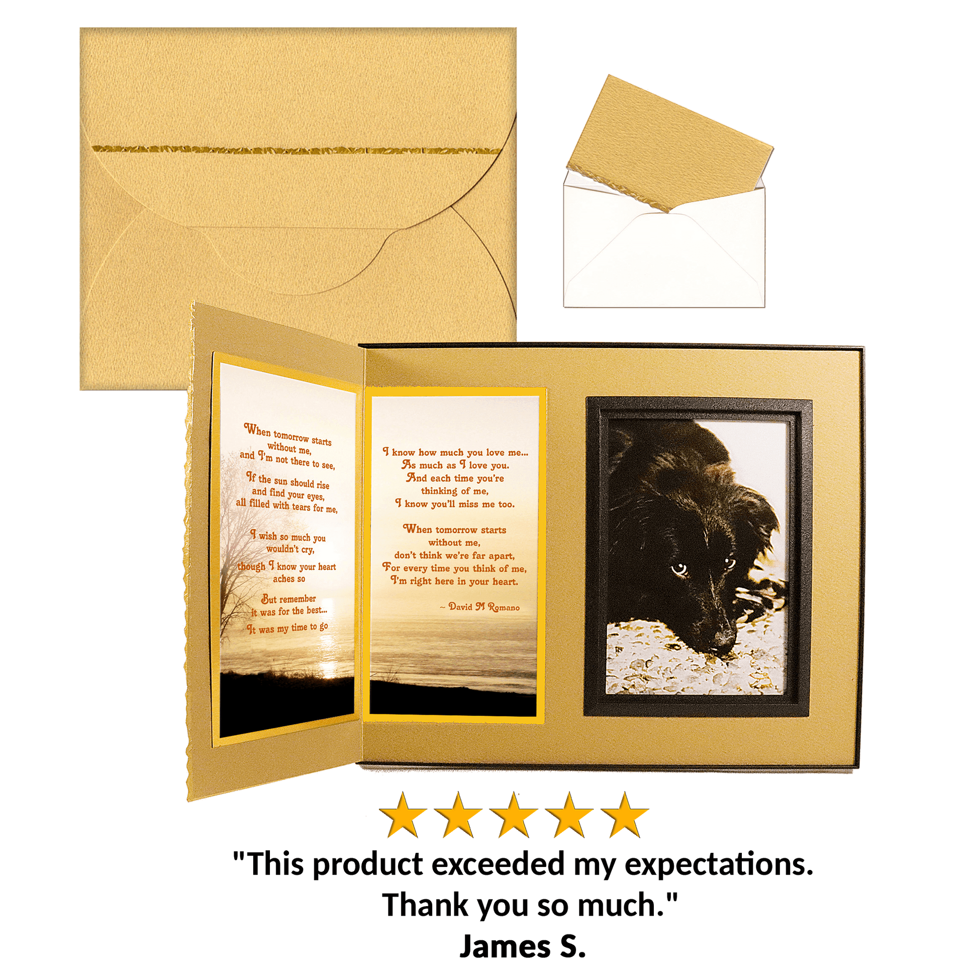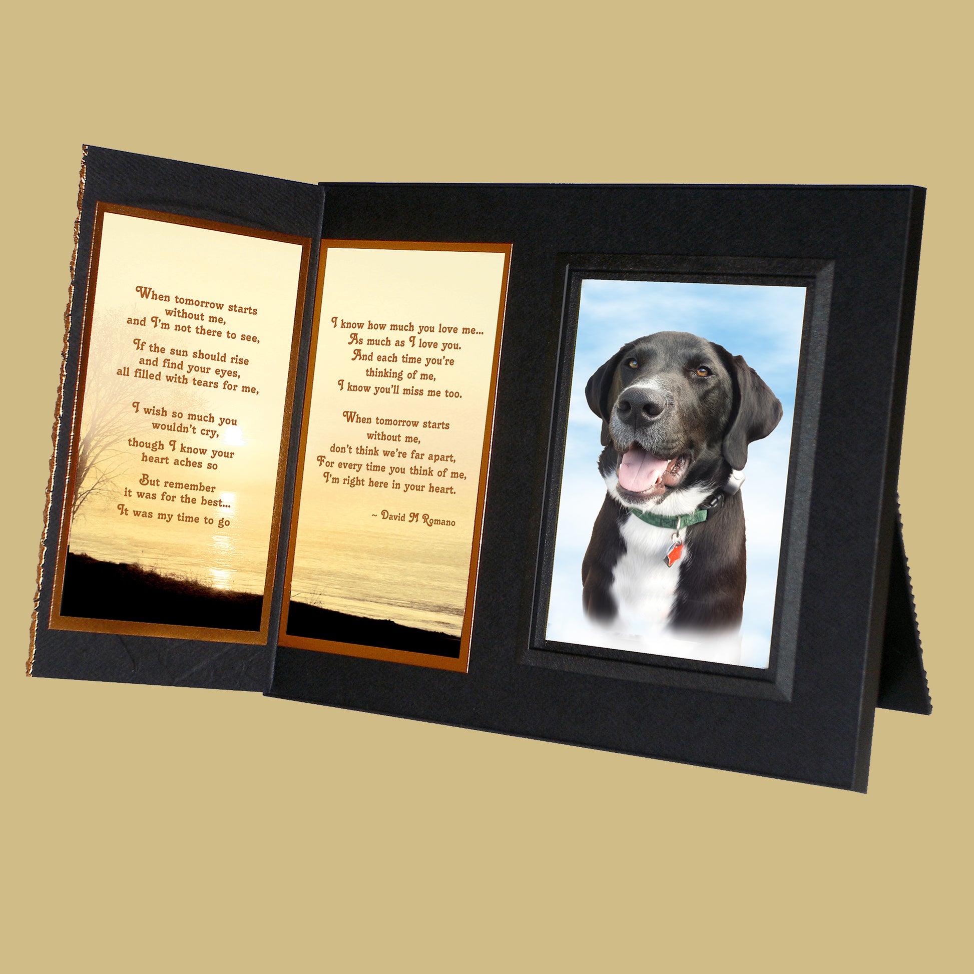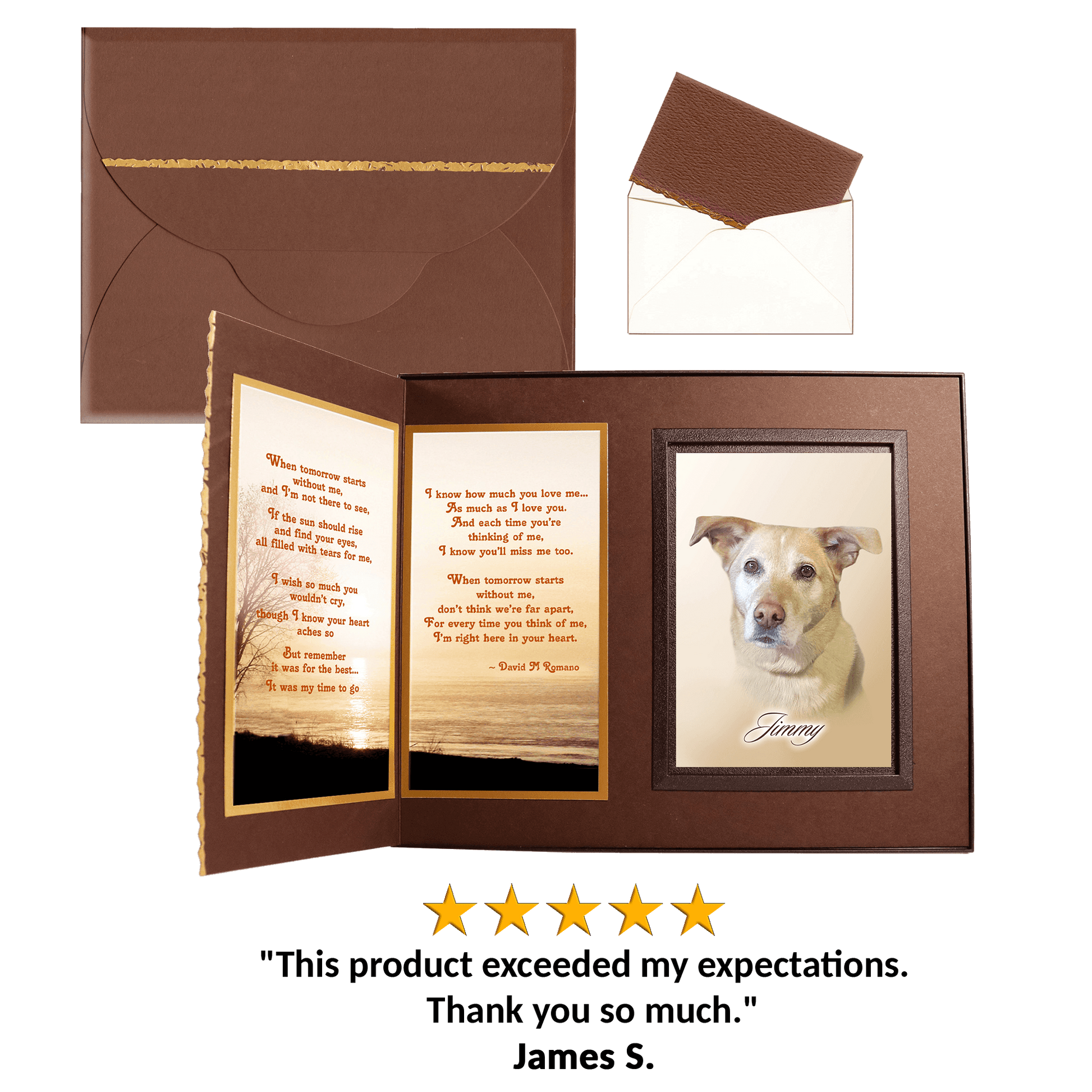 Personalized for you, this gift includes your choice of comforting poems, the pet’s photo, a gift card for your personal message... all elegantly presented in a matching gift box to make a complete gift ensemble.